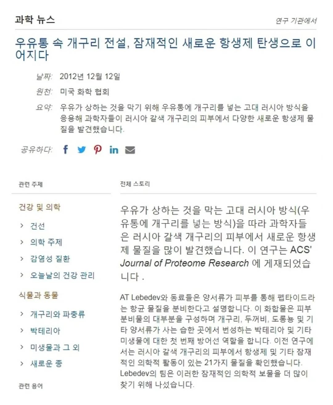옛날에 러시아에서 우유를 보관하던 방법은 개구리를 넣는 것이었다. 러시아에 서식하는 '러시아 갈색개구리'는 몸에서 항균 펩타이드(아미노산으로 구성된 단백질의 기능적 최소 단위)를 분비해 박테리아와 다른 미생물로부터 자신을 보호하는데 이게 우유에도 영향을 줘서 좀 더 신선함이 유지됐다고 한다.