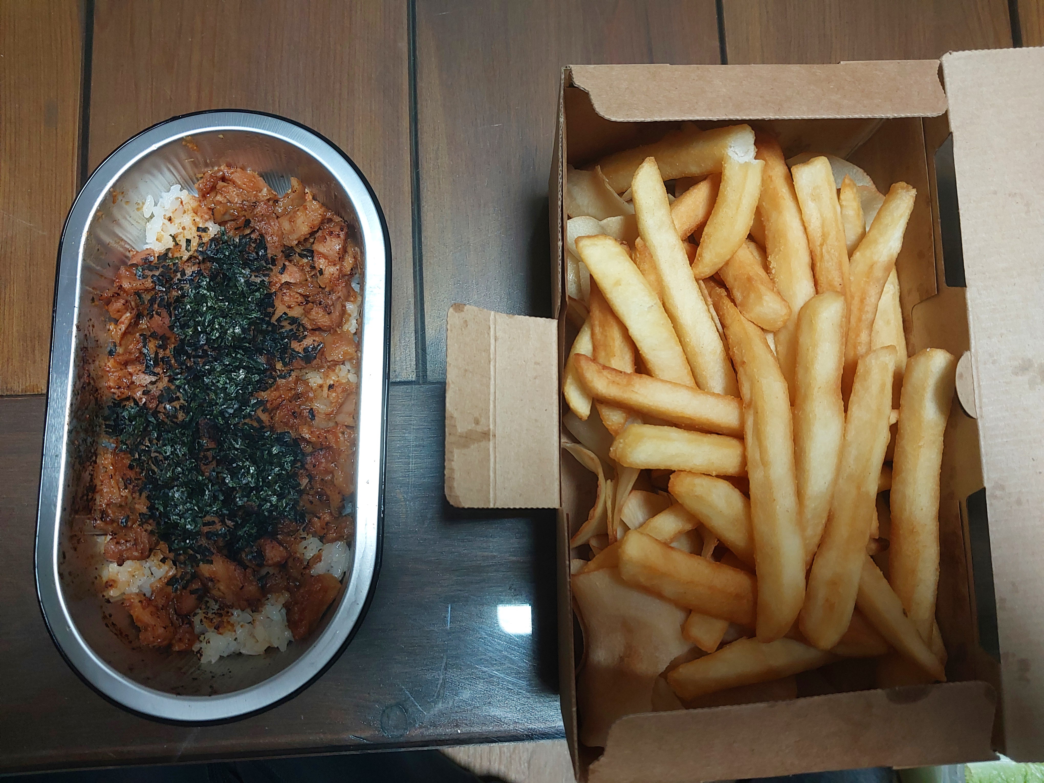 덮밥은 순한 맛인데 일부러 매운 소스를 넣어서 맵게 먹은!! 감자칩은 환상적인 맛~~