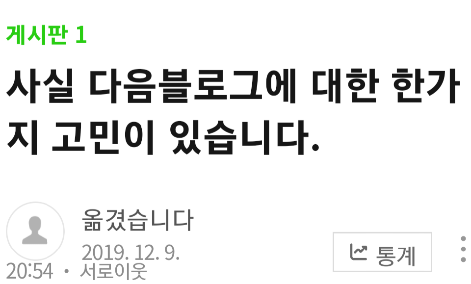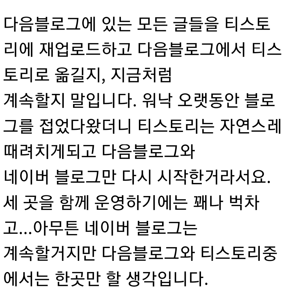 기존의 다음블로그가 1차 종료에 2차 종료까지 했으니 말입니다...즉 다음블로그는 티스토리 그 자체인 것. 으아 글들 날아간건 너무나 아깝다...게임글, 정보글, 일상글, 생각을 쓴 글, 그 밖에 이쁜 사진들 있던 곳이었는데.
