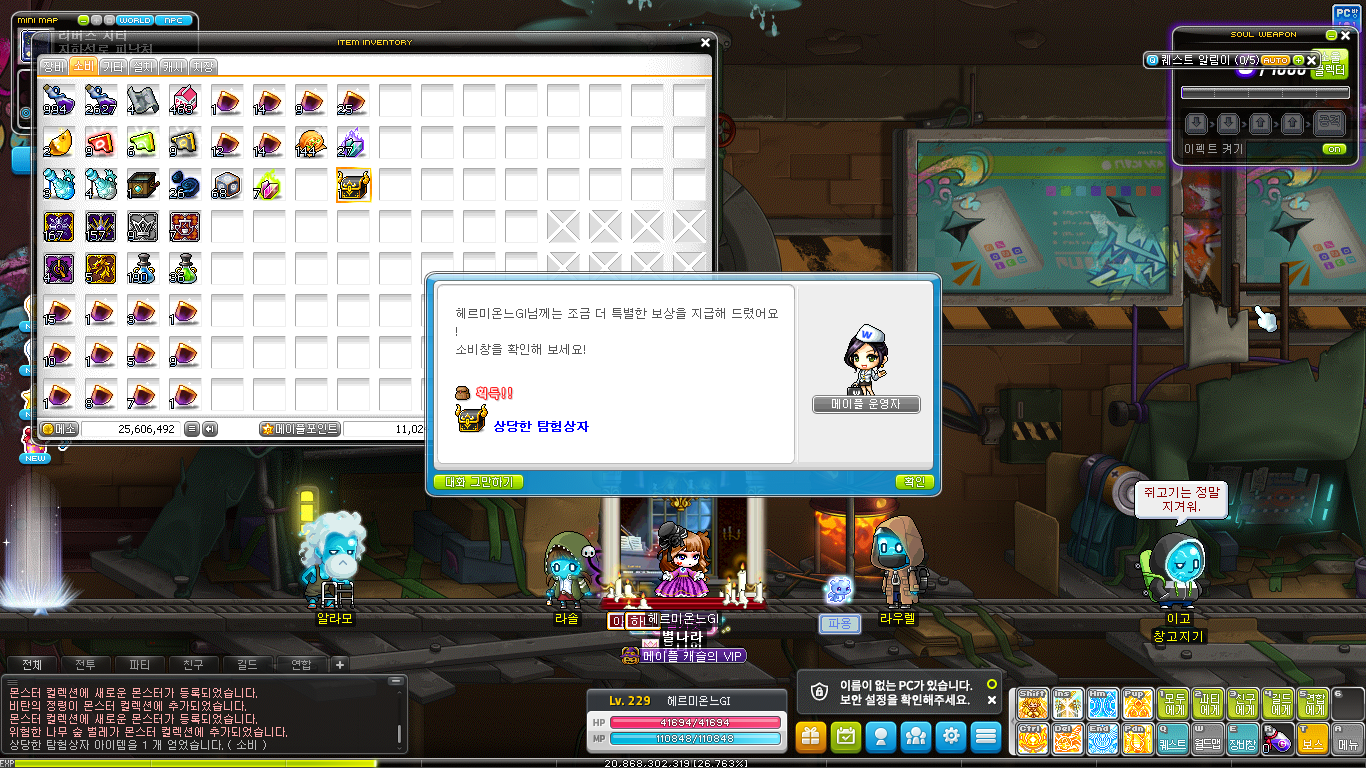세 개를 다 까보니 몹 두 마리 등록. 나머지 하나는 상당한 상자인데 상자 보상은 별거 없었습니다 ㅋㅋㅠ