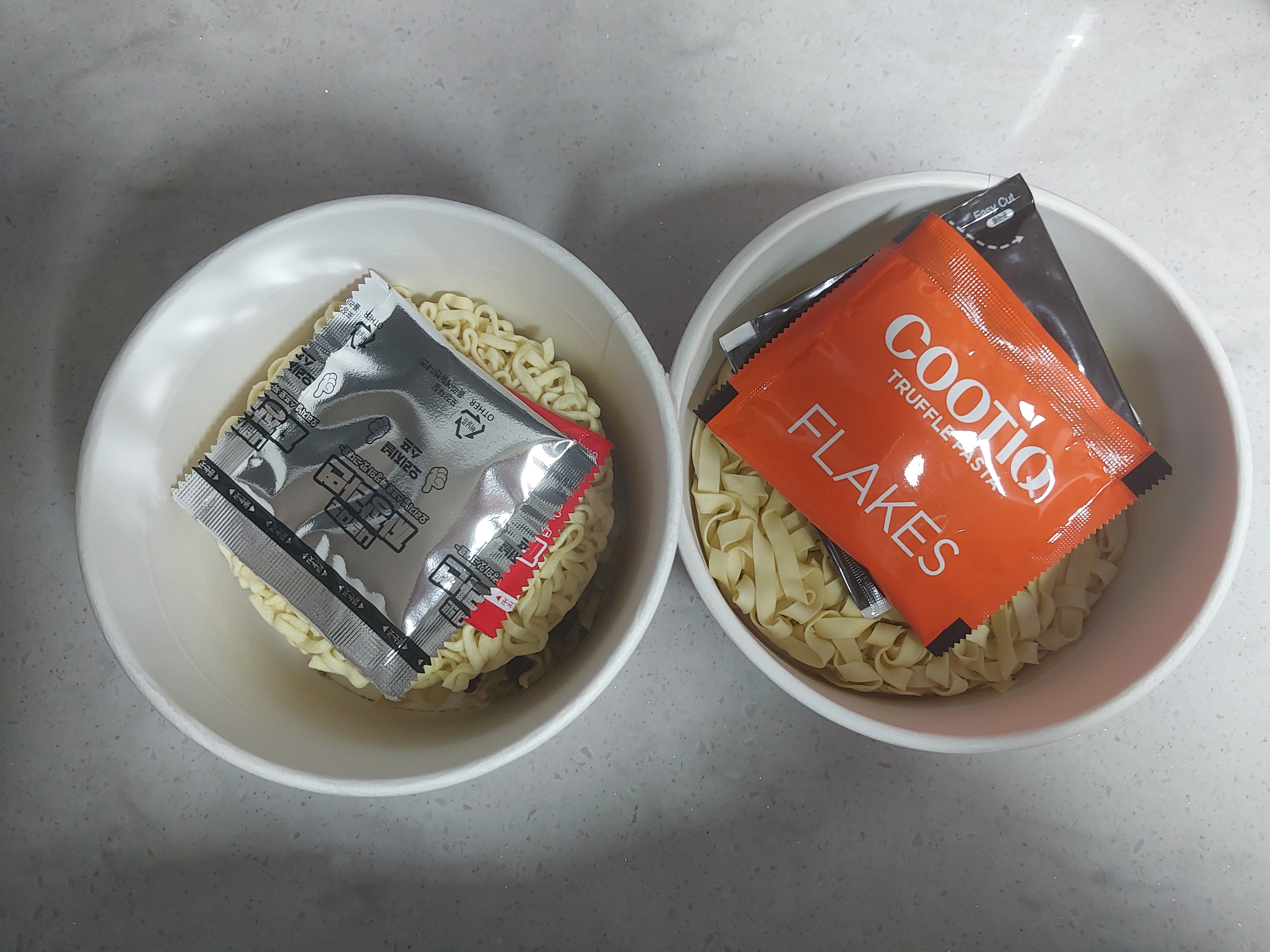 바로 노브랜드 짜장 사발면과 쿠티크 트러블파스타! 고기 남은 것과 함께 먹었습니다 ㅎ