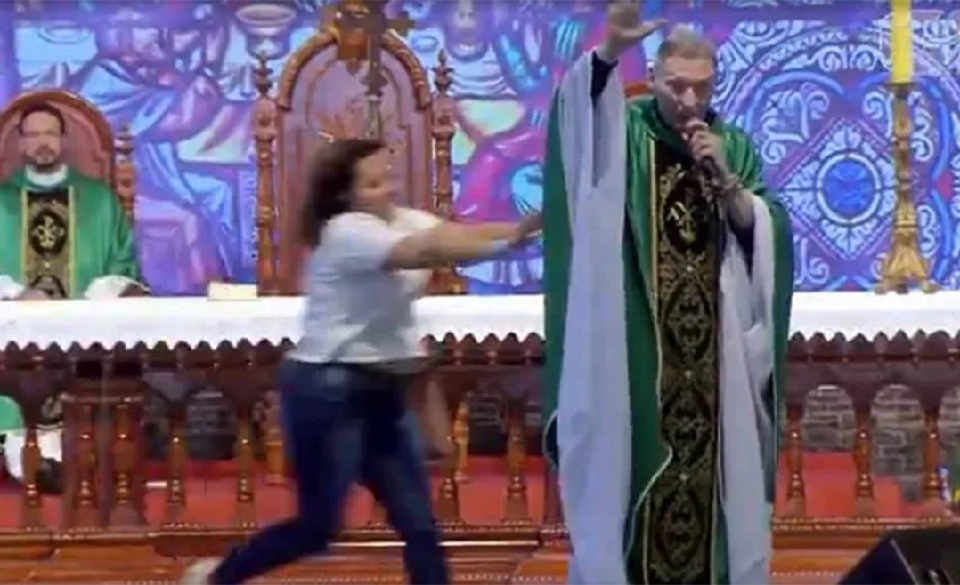 기도회 도중 난입한 여성에 의해 무대 아래로 떨어지게 됩니다.