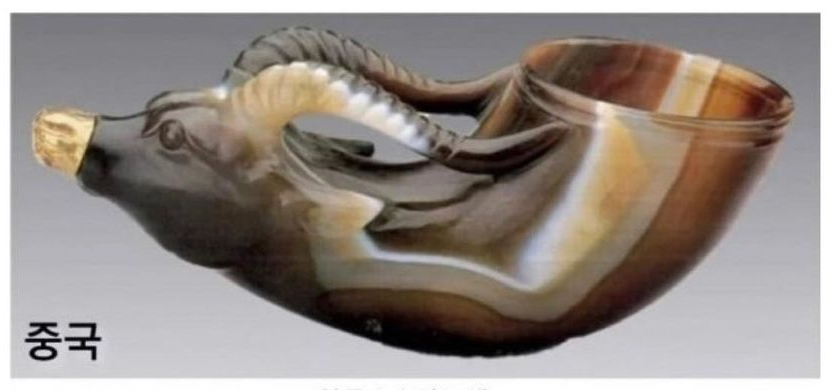 중국 언론에서 조사한 중국인이 가장 좋아하는 유물 랭킹1위를 차지했다. 당나라 때 만들어진 술잔이라는데 옥의 미친색감과 배열이 역대급이라 중국인들이 자랑스럽게 여긴다고 한다. 입과 코처럼 보이는 곳은 금이고 나머지는 옥이라 한다. 별개로 설문조사를 할 때마다 옥으로 만든 유물들이 상위권을 독점한다고...