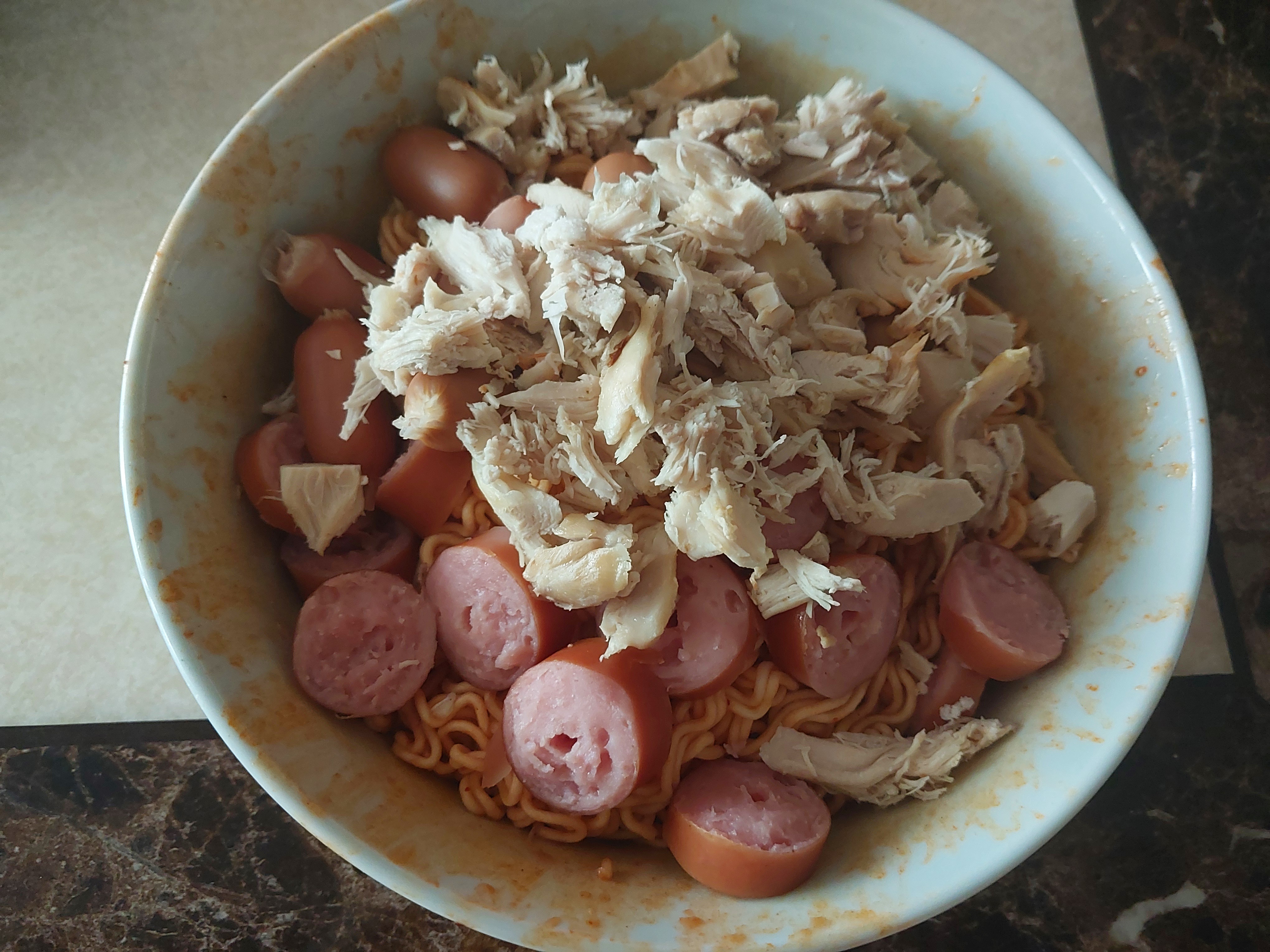 재료는 소시지와 닭고기. 넣은 양념은 라면 수프와 불닭 소스. 또 면을 사이다에 불렸죠
