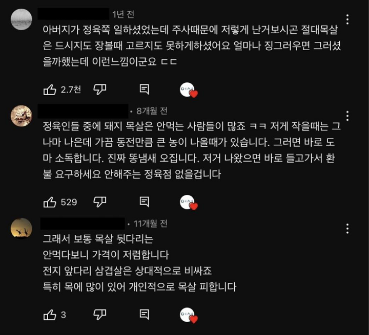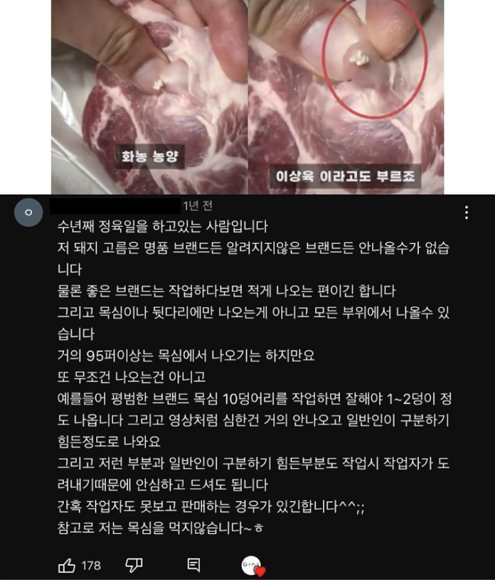목살, 뒷다리살= 농양(염증 고름)덩어리가 있을 가능성이 높아서. 특히 목살찌개, 목살큐브 등 잘게 잘려진 목살