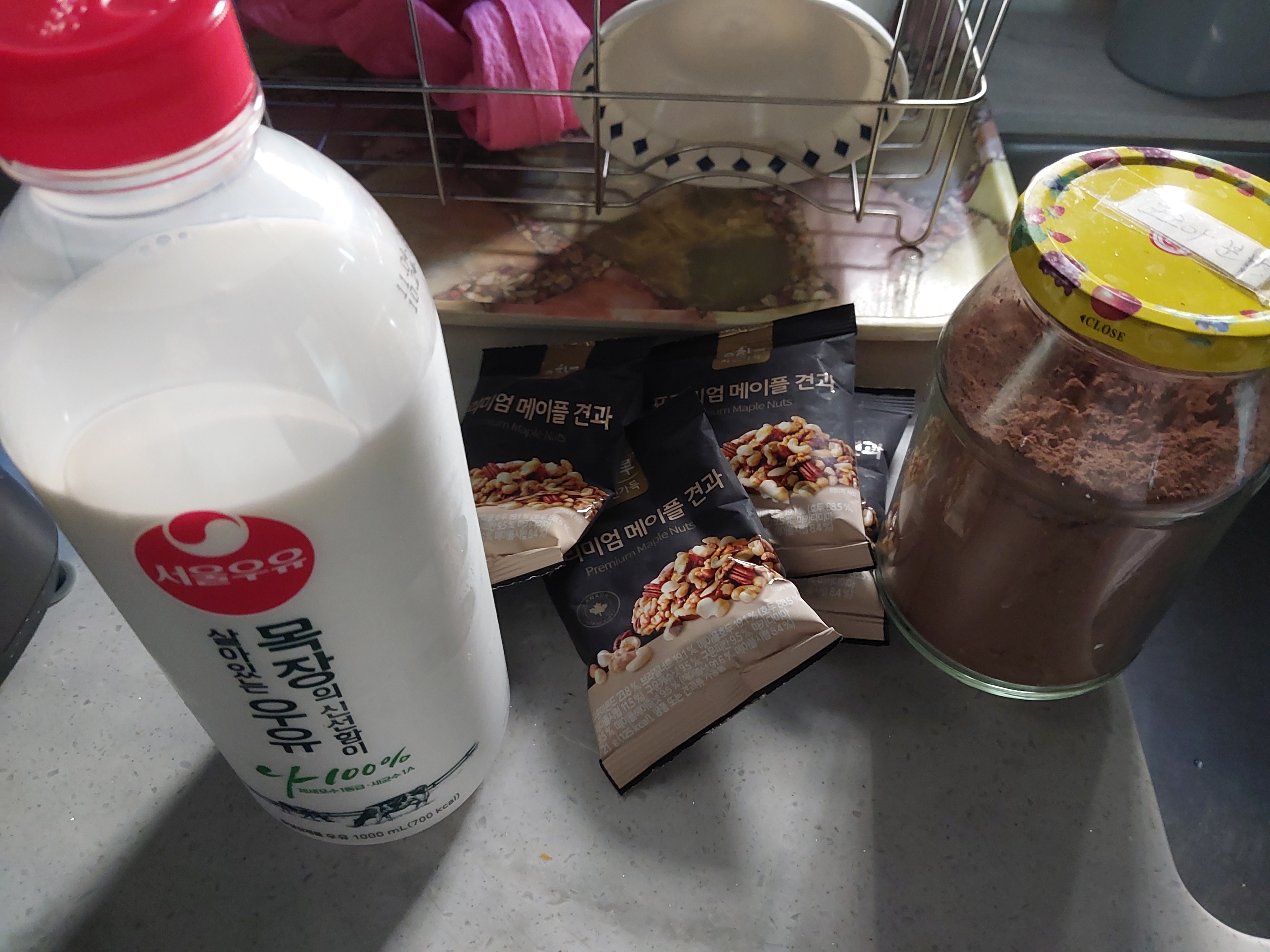 재료는 단 맛나는 견과류와 우유와 단 맛이 없는 초코가루.