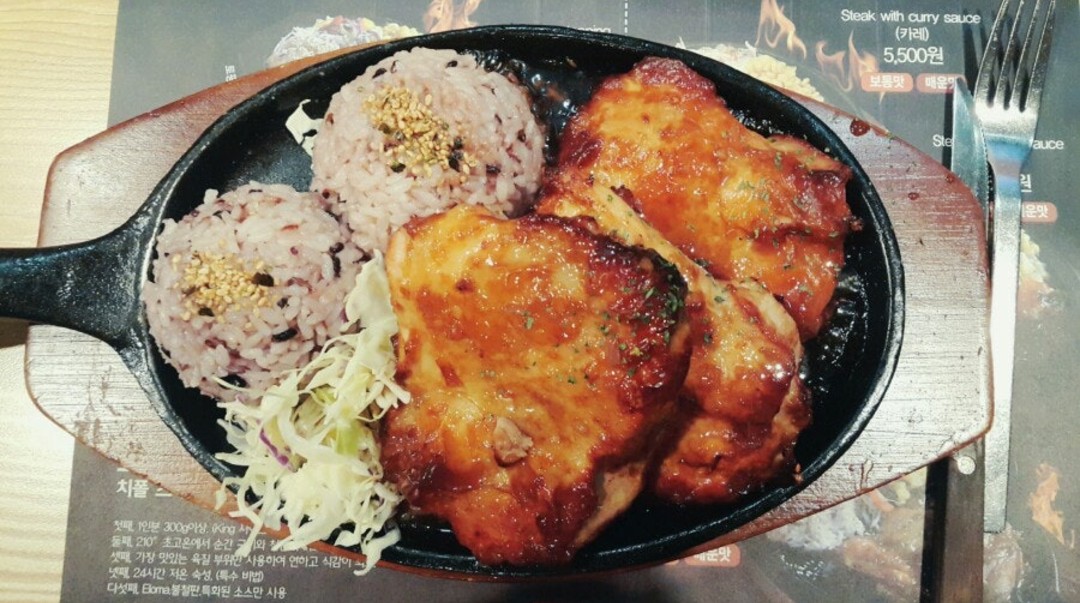 지글지글 철판에 올려진 치킨 스테이크와 곁들인 잡곡밥, 그리고 아삭한 양배추 샐러드까지. 누군가가 이걸 ‘마음까지 따뜻하게’ 내어줬다면, 그 날 하루는 참 든든했을 거예요.