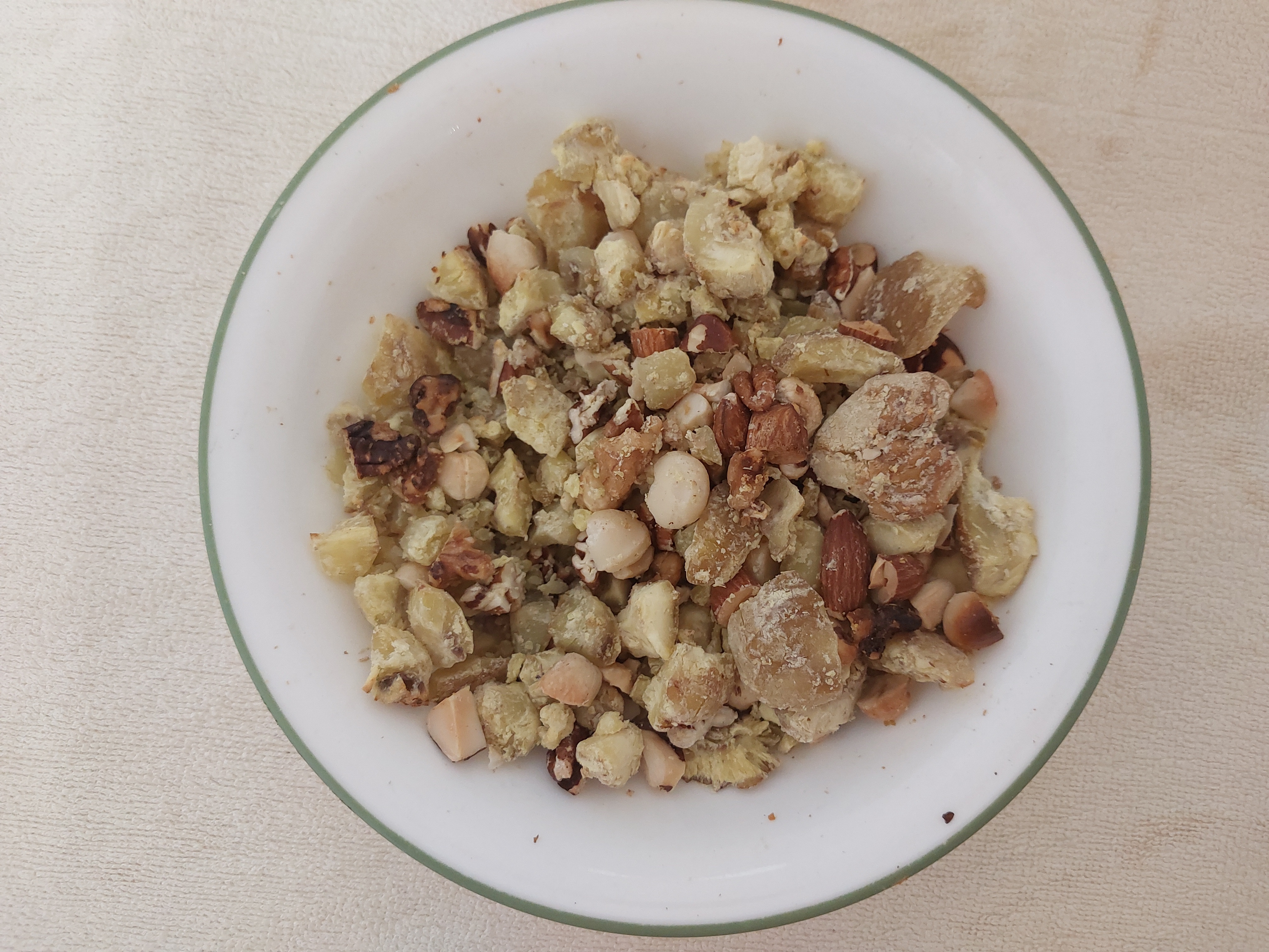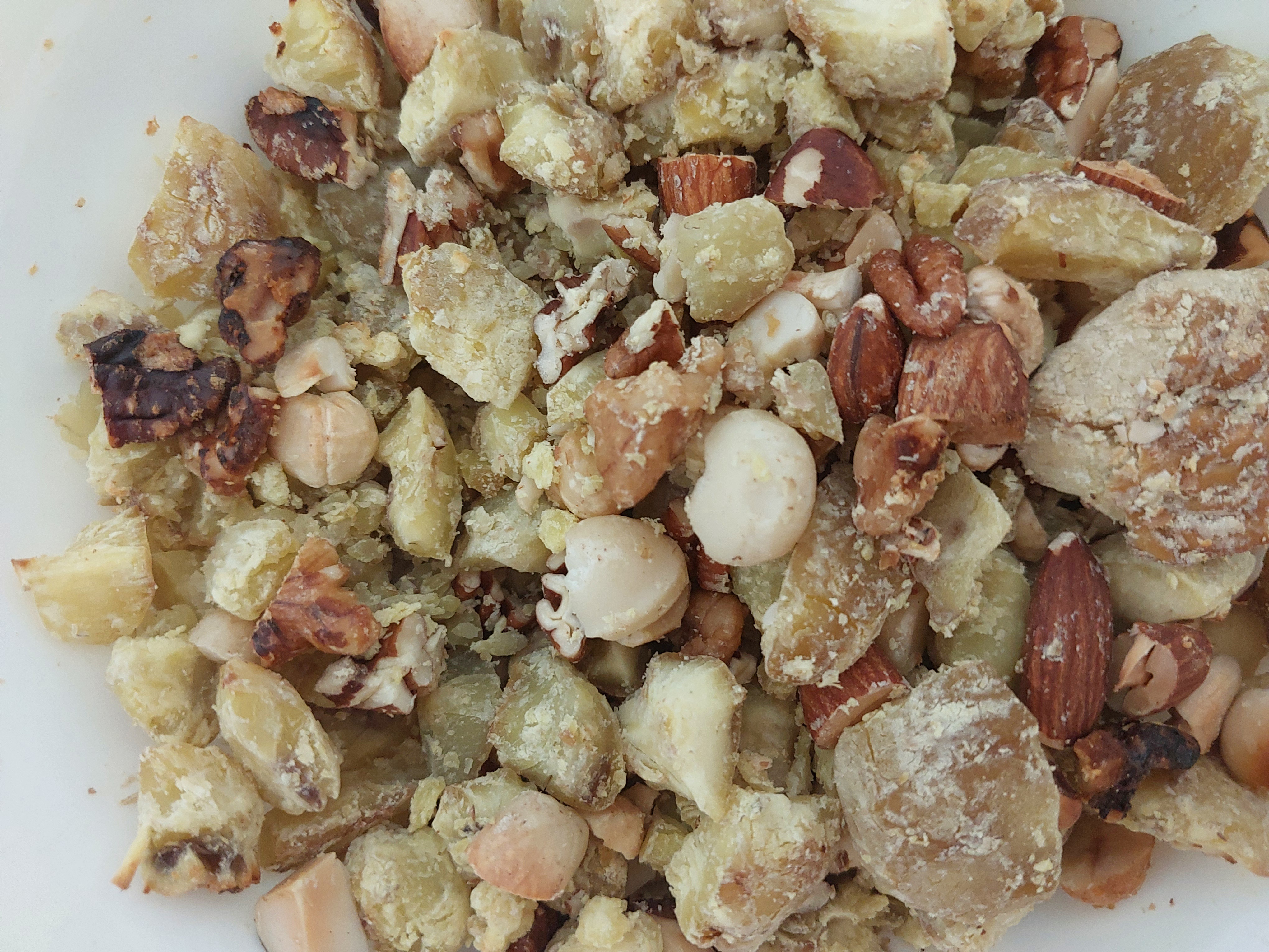 재료는 단 맛나는 견과류와 삶은 밤을 깐 것을 섞은 것.
